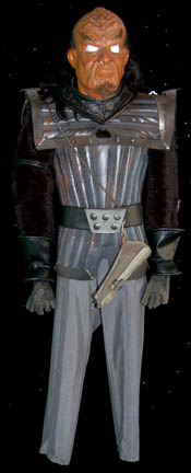 A Klingon costume appearing variously in Star Trek episodic television with a rubber full head enclosing mask featured in Star Trek VI: The Undiscovered Country. The costume is gray spandex trousers with vinyl uniform top armor. The costume comes with a metal shoulder aglet and chain for the accompanying holster, … |