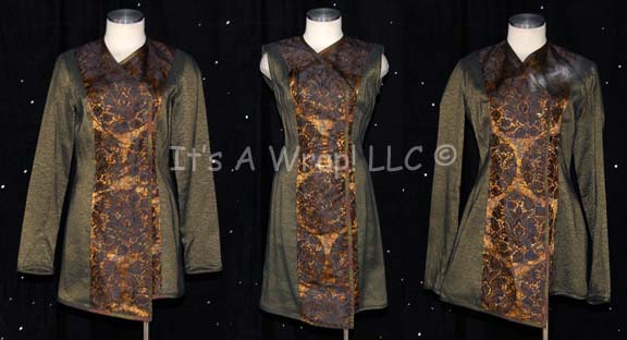 A costume featured in the Star Trek: Voyager episode “Flesh and Blood: PART I”; wherein “Voyager” answers a distress call from a Hirogen base that has been utterly decimated by the holograms from the holodeck technology that “Captain Janeway” (Kate Mulgrew) gave them. This costume is a long-sleeved, metallic-copper tunic … |