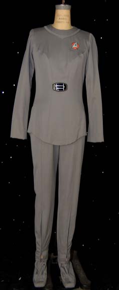 A gray Starfleet Class-A uniform featured in Star Trek I: The Motion Picture. This costume consists of gray trousers and matching long-sleeved, shirt featuring a sewn on Sciences orange backed Starfleet emblem patch on the left breast, matching shoes with sewn on leggings and an attached bio-monitor; brown plastic with … |