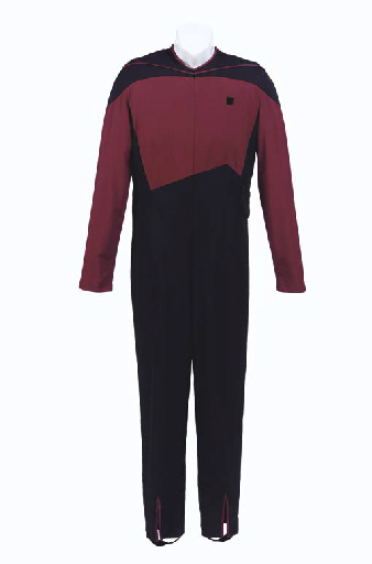 A first season-style burgundy and black Starfleet uniform jumpsuit, with <I>Star Trek: The Next Generation</I> label inside inscribed <I>Michael Dorn</I> - worn by Michael Dorn as Worf in <I>Star Trek: The Next Generation</I>; with corresponding wardrobe tag |