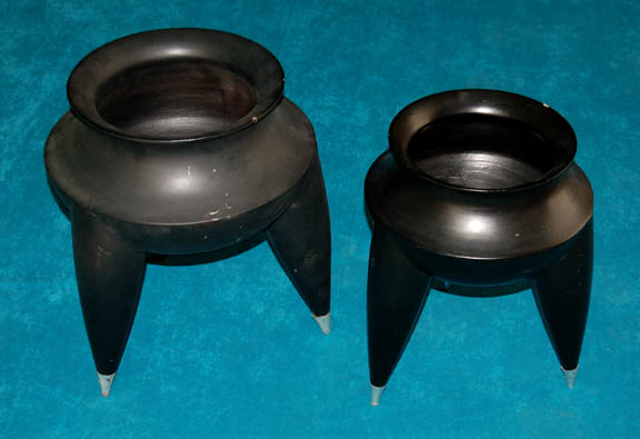Both these sturdy cauldrons were used in the filming of Star Trek episodic television. They are each made of wood painted black with three legs. The legs culminate in points that have been decorated with silver color metal tips. The large cauldron measures approx. 14 ½ x 12 ½ inches, … |