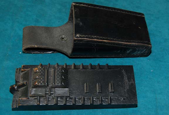 A black colored Starfleet security device and holster believed to have been created for Star Trek III: The Search for Spock. The holster is fashioned black leather with a belt loop that snaps to the inside in two places. The hand prop device is a solid resin affair with molded … |