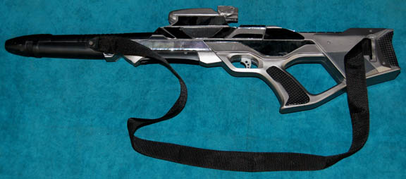 A high quality cast resin prop Starfleet phaser rifle used in Star Trek X: Nemesis. This rifle is painted metallic silver and features metallic chrome application accents, a targeting ‘scope' that is broken off due to storage conditions, a fixed position shoulder strap of black nylon, and a mount for … |