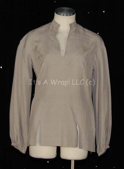 A gray colored uniform shirt like those appearing in Star Trek I: The Motion Picture. The item is long sleeved with a low cut front and features elastic at the sleeve cuffs. A sewn in Paramount tag reads ‘10’. |
