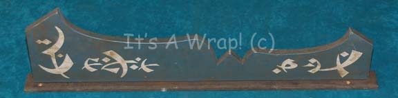 An advertising sign featured in the Star Trek: Enterprise episode “Rajiin” as part of the Xanthan Bazaar set. The item is fashioned wood sign made to screw into a set wall with screw holes for wall mounting on the bracing piece, and white painted alien iconographic lettering on the perpendicular … |