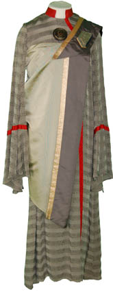 The costume consists of a light gray robe with patterned horizontal stripes, and a red stripe running round the belled sleeves and down the length of the fabric in the front. The robe zips up the back and clasps at the top. The sash is gold and silver separated by … |