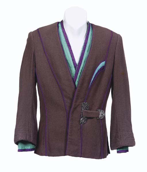 A brown suit jacket with purple trim and green long-sleeved shirt with purple trim, the shirt with <I>Western Costume</I> label inside inscribed <I>Geo Takei</I>, the jacket with label inscribed <I>George Takei</I> -- worn by George Takei as Sulu in <I>Star Trek IV: The Voyage Home</I>; with corresponding wardrobe tag (2) |