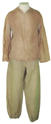 A caramel colored medical officer's uniform featured in Star Trek V: The Final Frontier for wear by DeForest Kelly in his portrayal of “Dr. McCoy”. The costume is wool trousers with green division stripes down the outside seam of the legs, a pair of green sleeveless undershirts with ribbed collars, … |