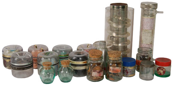 This extensive collection of different containers is from the Star Trek universe and includes an array of interesting pieces. There are four plastic containers that are sealed shut and have an assortment of shell shaped soaps of various colors inside them. Each container has also had thin strips of colored … |