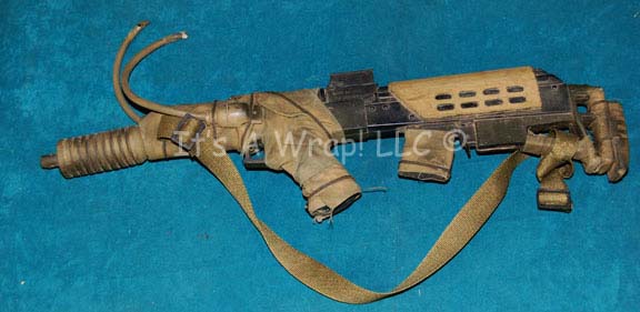 An item featured in the tenth Star Trek feature film, “Nemesis”, used by the Kolarans in the ‘Argo’ chase scene. This item is a ‘shotgun' with a shoulder strap and a shortened, banana clip style magazine with olive-colored cloth accents wrapped around it and two matching rubber tubes that would … |