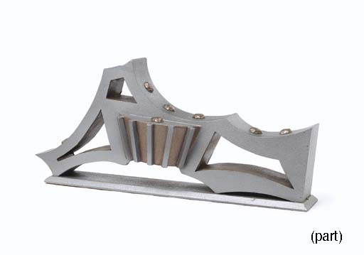 Three signs made from wood, particle board, and acrylic plastic painted as metallic pewter and bronze in Cardassian style, third sign is carved foam, painted as distressed, sculpted stone, largest -- <I>35x42x8in.</I> -- used as set dressing on the promenade set of <I>Star Trek: Deep Space Nine</I> (3) |