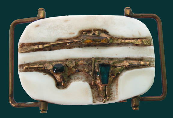 A white plastic buckle with inset copper accents featuring an assortment of ‘gems' attached to a pair of metal clips for a belt. (Recommended use on a belt featuring two strips of leather/cloth that latches elsewhere, as the buckle is for adornment only.) Believed to have been worn in various … |