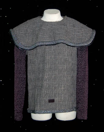 | (Paramount-TV, 1995-2001) Short sleeve olive-colored under-jumpsuit with gray/ green sheer blouse worn by Jennifer Lien as “Kes” in the pilot episode when she boards the Voyager after escaping her abuse as a slave with the Kazon-Ogla on the surface of her world. Both garments have internal Voyager costume labels handwritten … |