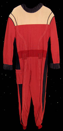 A Starfleet uniform jumpsuit of the style appearing first in Star Trek II: The Wrath of Khan and continuing service through at least Star Trek VI: The Undiscovered Country. The costume is red with black lining and tan colored shoulders and chest. The black ribbed collar and cuffs indicate the … |