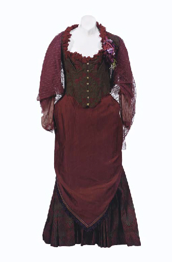 A bodice of green and red brocade with lace-up fastening to the back, with a matching full skirt, and hooped underskirt, all with <I>Star Trek: The Next Generation</I> label inside inscribed <I>Brent Spiner</I>, with lace shawl, earrings, brooch, and silk flowers -- all worn by Brent Spiner as Data, playing … |