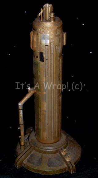The prop Arkonian transceiver featured in the Star Trek: Enterprise episode “Dawn” that was repaired by “Commander Tucker” (Connor Trinneer). The item is a large cylinder with a wide base that is made from fashioned wood with an aluminum shell, a series of acrylic panels covering light bulbs ring the … |