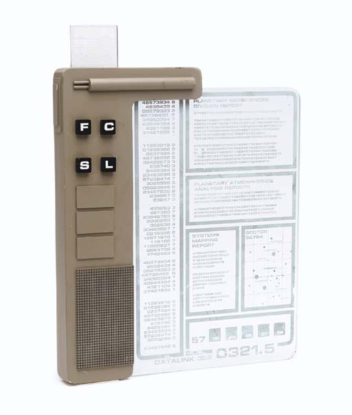 A clear acrylic prop clipboard with side-mounted control unit and fixed "isolinear card", with silkscreened Starfleet-style graphics -- used in the <I>Starship Excelsior</I> scenes of "Flashback", <I>Star Trek: Voyager</I>, and based on a prop used on the <I>Excelsior</I> in <I>Star Trek VI: The Undiscovered Country</I> |