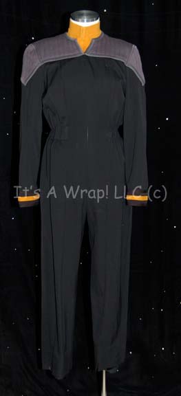A Starfleet uniform in the style that made its first appearance in Star Trek VIII: First Contact comprised of a full-length black jumpsuit with gray quilted shoulders. The jumpsuit features black elastic stirrups at the feet, a form fitting elastic waistband sewn inside with attached loops for ‘away team’ gear, … |