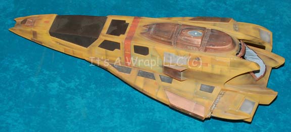 A model created for the pilot episode of “The Osiris Chronicles” or “Warlord: Battle for the Galaxy” as it was titled in the United Kingdom. The item is a detailed model of a speedy looking shuttle rather like a Starfleet Runabout, but colored yellow with metallic gold accents and distressed … |