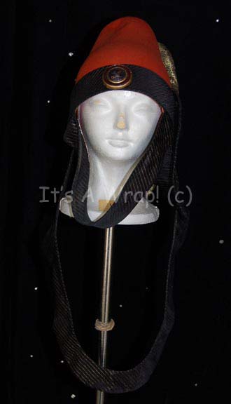 A costume element similar to those featured in various Star Trek feature films. This item is a rust-colored felt, Vulcan-style hat featuring soft, black and gold pin-striped trim, chinstrap, and drape that sits upon the chest; a large metallic-gold colored accent in the back has a black floral pattern and … |