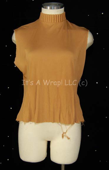 A tan colored sleeveless undershirt created for use in Star Trek feature films. The item is sleeveless and features a metal zip up the spine. A sewn in Paramount tag reads ‘Size 10’. |