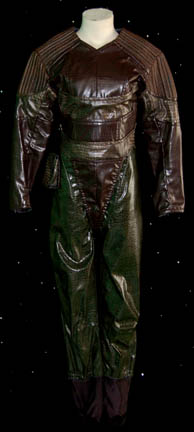 A black full length cast rubber body suit painted with silver details to give it an armored appearance, with matching gloves, and boots. The right breast features a pair of green lights that are molded into the costume and activated by a battery box housed behind the left shoulder, which … |