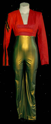 Featured in the Star Trek: Voyager episode “Favorite Son”, this sexy V-neck dress is orange with black trim. A thigh length split up the left leg reveals the chic black lining. Costume comes complete with costume tag indicating wear by “Reba Shaw Alexander”. |