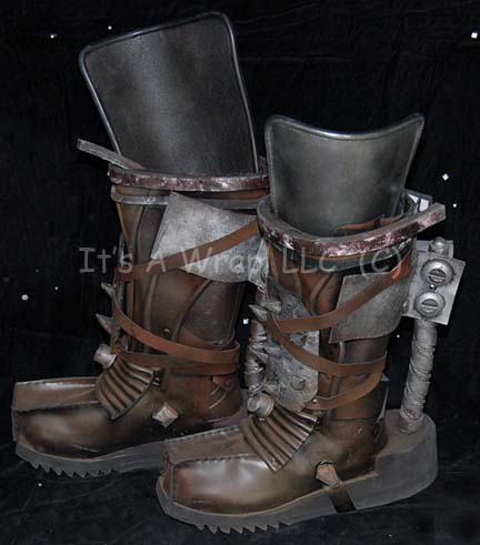 A pair of boots similar to those featured in Star Trek: Enterprise like “Bound” and “Borderland”. These boots are size 12, black, vinyl "Cabelas" brand featuring various pieces of brown vinyl attached, an elongated, black foam rubber heel, in addition to several silver-colored foam rubber accents, a resin cast, spiked … |
