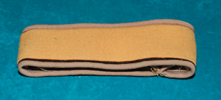 A costume division strip corresponding to a Starfleet field duty, or commando style, uniform like those featured in Star Trek V: The Final Frontier. The item is gold colored fabric on a black felt background with caramel colored trim edges. Items like this appeared on the uniforms of “Commander Sulu” … |