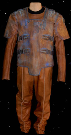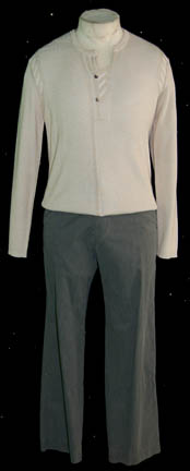 A costume featured in multiple Star trek episodes with multiple sewn in Voyager tags indicating use by ‘Rick Worthy', ‘Tim Russ’, ‘Robbie McNeil’, ‘Jeff Austin’ who portrayed the alien “Allos” in “The Omega Directive”. The trousers feature sewn in Voyager tags reading ‘Ethan Phillips’ and ‘Glen Goldstein’. |