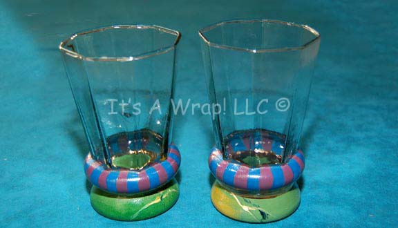 A pair of octagon shaped clear glass drinking vessels featured in the Star Trek: Enterprise episode “Azati Prime”. Appearing during scenes when “Degra” (Randy Oglesby) and his crew are toasting to their impending success, the items are ‘Victoria and Richard MacKenzie-Childs LTD’ name brand glasses painted with blue and purple … |