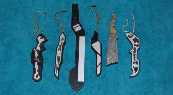 A lot of hand prop picks created for episodes of Star Trek: Deep Space Nine. The items are molded resin painted black with metallic silver painted raised features, some with metal wire picks embedded at odd angles. One item is devoid of any extruding metal. The largest item measures approx. … |