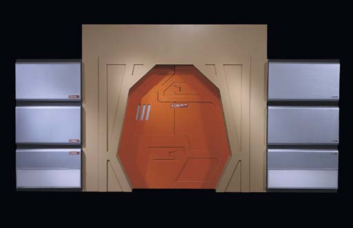 Two theatrical wall flats made of wood and particle board, one doorway and one pair of nonfunctional futuristic doors, doors feature an interlocking design, one wall flat -- <I>8ft.x51in.</I> -- and the other --<I>47in. wide</I> -- door arch -- <I>10ft.x133in.</I> -- arch opening -- <I>7½x7ft. wide</I> -- made for "These … |