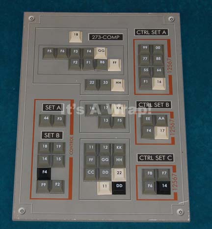 A piece of set dressing like those featured in episodes of Star Trek: Enterprise involving ‘older’ and civilian computer systems. This item consists of black sheet plastic featuring a gray, graphical application on the front with multiple, multicolored, faux buttons with alpha-numeric values, arranged into groups labeled as ‘CTRL SET’ … |