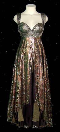 Serving drinks, running the gaming tables, and keeping the patrons interest is all part of the job when you're one of “Quark’s” (Armin Shimerman) “Dabo Girls”. It’s easy to appear interesting with a costume like this. It is comprised of sparkly gold tights; an attached bronzed skirt with gold patterned … |