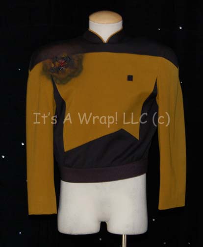 A costume element similar to those featured in various episodes of Star Trek: The Next Generation. This costume element is a black, Starfleet uniform top featuring Operations Gold along the front, back, sleeves, and as piping along the Mandarin collar; a Velcro placement for a commbadge (sold separately), a zip … |