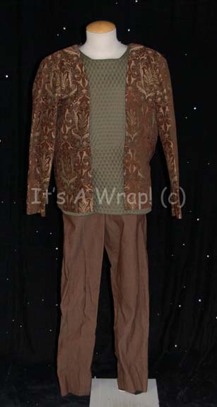 A stunt costume featured in the Star Trek: Voyager episode “Darkling” for wear by Tom Morga performing stunts as “Zahir”. The costume is brown pseudo-corduroy trousers, and a quilted green shirt with an affixed patterned jacket. Both garments are labeled with Voyager tags reading ‘Tom Morga’ and the costumer’s tag … |
