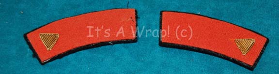A pair of red engineering division-rank strips featured on Starfleet uniforms in Star Trek I: The Motion Picture. The item is red fabric on a black felt board with a gold thread triangle on one end indicating the wearer to be a ‘petty officer’. This style of accent would have … |