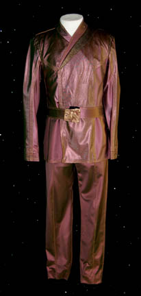A Romulan senator’s robes featured in Star Trek X: Nemesis. The costume is a blue under robe with zips at the sleeve cuffs, an a geometrically patterned collar, an outer robe with kimono style sleeves, and a dickie with a mandarin style collar. The costume comes with a a pin … |