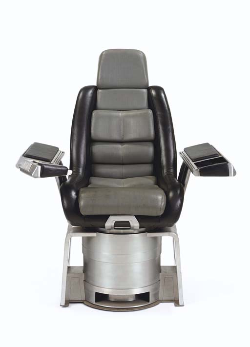 A grey and black imitation leather automotive seat with padded aluminum arm rests and swivel aluminum base, left arm rest includes provision for installation of a <I>7in.</I> LCD video monitor -- <I>45x39x30in.</I> -- used as Captain Archer's command chair on the <I>Starship Enterprise</I> during the first three seasons of <I>Star … |