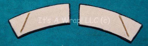 A pair of security silver division-rank strips like those featured on Starfleet uniforms in Star Trek I: The Motion Picture. The item is off-white fabric on a black felt backing with a thin gold thread embellishment. This style of accent would have appeared on Starfleet Class-B, C, and D uniforms. … |