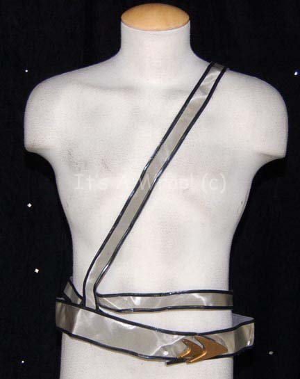 A wardrobe accessory featured in the Star Trek: The Next Generation episode “Yesterday’s Enterprise” for wear by Starfleet officers and crewmen in the alternate reality created by the emergence of the “U.S.S. Enterprise-C” from a temporal anomaly. The item is a reflective silver colored vinyl belt with black vinyl trim … |