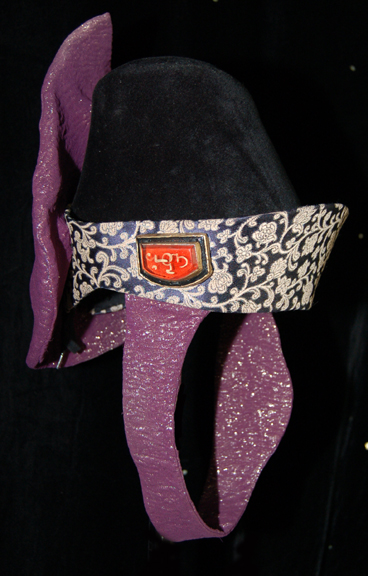 A costume element of the style featured in Star Trek III: The Search for Spock” and “The Voyage Home”. This item is a black, felt hat of the Vulcan-style, featuring iridescent purple chinstrap and accent, dark-blue trim featuring a reflective, sage-colored floral pattern, and the faux jewel with Vulcan iconography … |