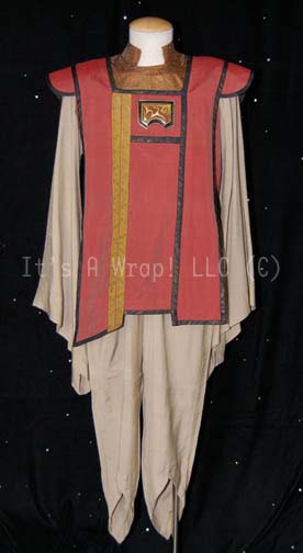 A costume lot similar to those featured throughout Star Trek: Voyager. The first costume is a uniform of a member of the Kazon-Nistrim, once one of the strongest but more recently one of the weakest sects; a sleeveless, woven tunic featuring a pattern of black, various shades of pink, and … |