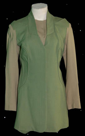 A costume featured in the Star Trek: Voyager episode "Remember" for wear by Athena Massey in her role as “Jassen” the Enaran who telepathically links with "B'Elanna Torres" (Roxann Dawson) to view her disturbing experiences. The costume is a two-tone green with long sleeves, v-neck collar, and a zipper/buttons/clasps running … |