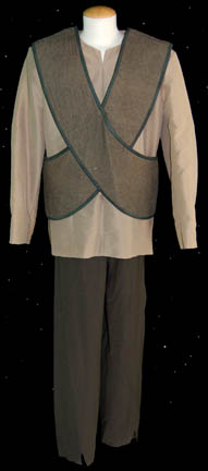 A costume featured in the ninth Star Trek feature film, “Insurrection”; wherein the crew of the “Enterprise-E” rebels against Starfleet and the Federation to prevent the exploitation of a defenseless race called the Baku. This costume consists of two sleeveless, metallic-colored, shirt of a spandex-like material, a long-sleeved, tan tunic … |