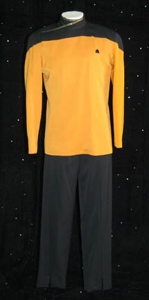 A male Operations gold scant made for wear during the Star Trek: The Next Generation series. The scant is black with a gold center section on the front and back and gold trim on the shoulders. There is a discreet zip up the front and a small Velcro patch on … |