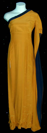 Featured in the Star Trek: Voyager episode “Favorite Son”, this sexy mustard color dress has a long flowing left sleeve and black trim. A thigh length split up the right side reveals the chic black lining, and comes complete with a costumer's tag indicating wear by ‘Jennifer Ferdinand’. |