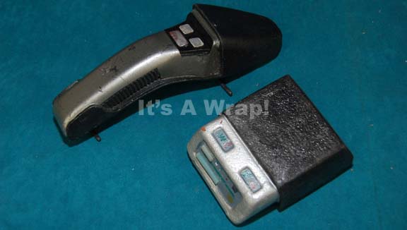 A pair of props featured variously in Star Trek episodic television for use by characters in Starfleet or the Federation, a tricorder and phaser, both molded into holsters. The items are intended to appear as though they can be removed and used. The tricorder is made from soft molded foam … |