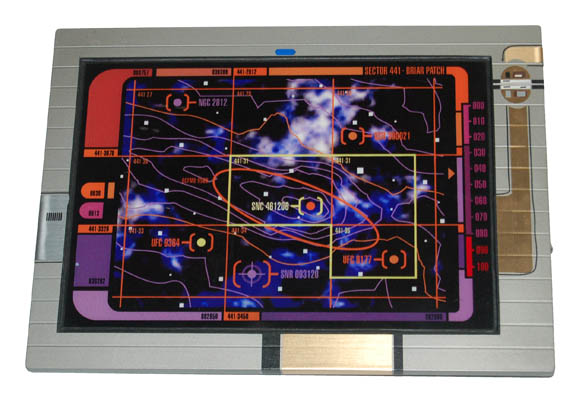 A Starfleet PADD (Personal Access Display Device) featured in the motion picture Star Trek IX: Insurrection. Made from plastic components with a backlit ‘screen' featuring a translucent application that depicts ‘Sector 441 – Briar Patch’ this item has working lights. Activated at a switch on the right side of the … |